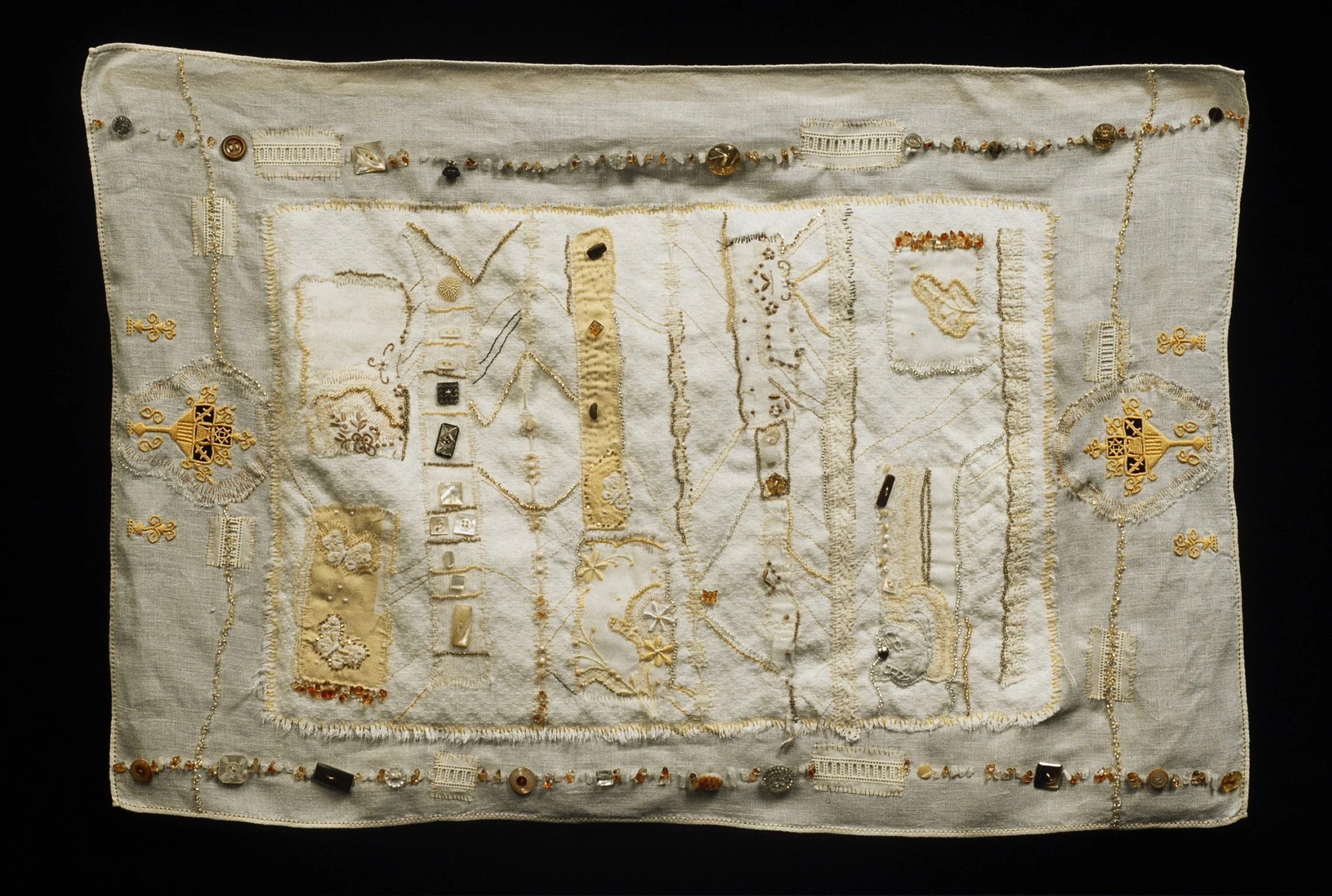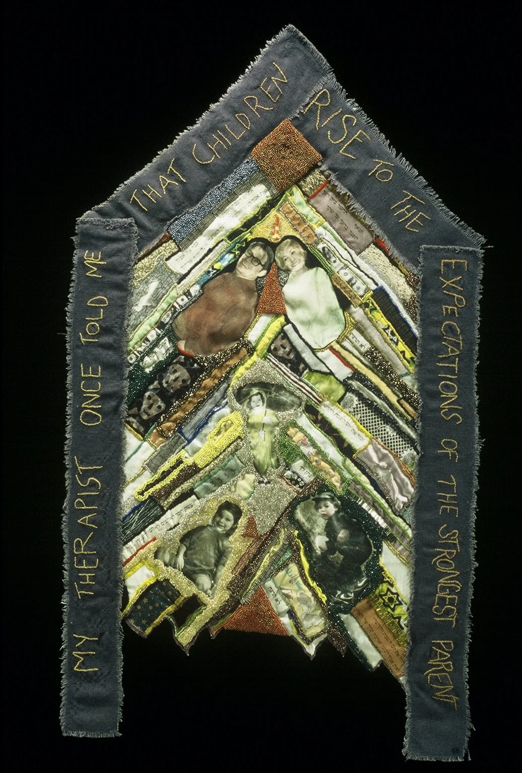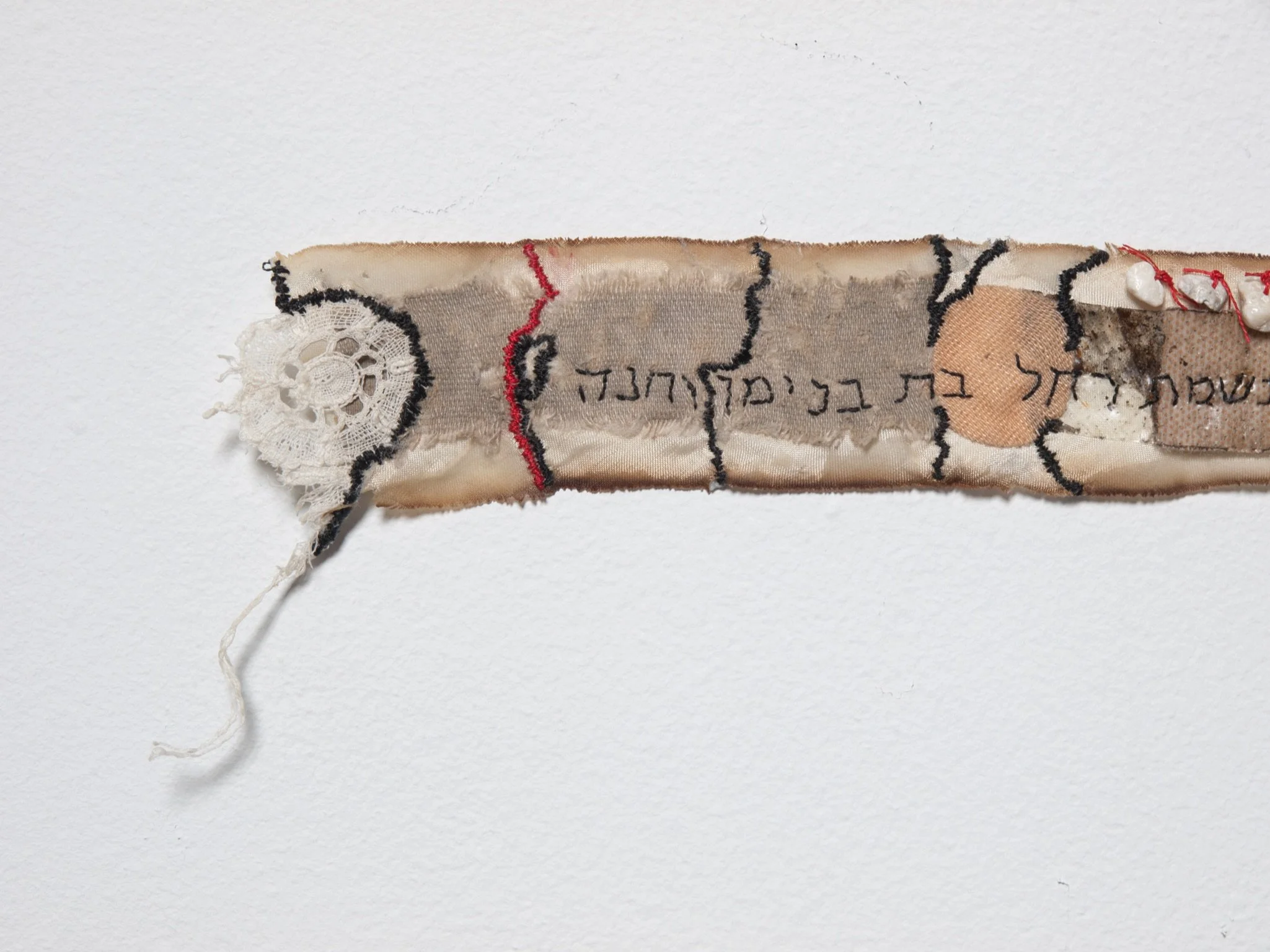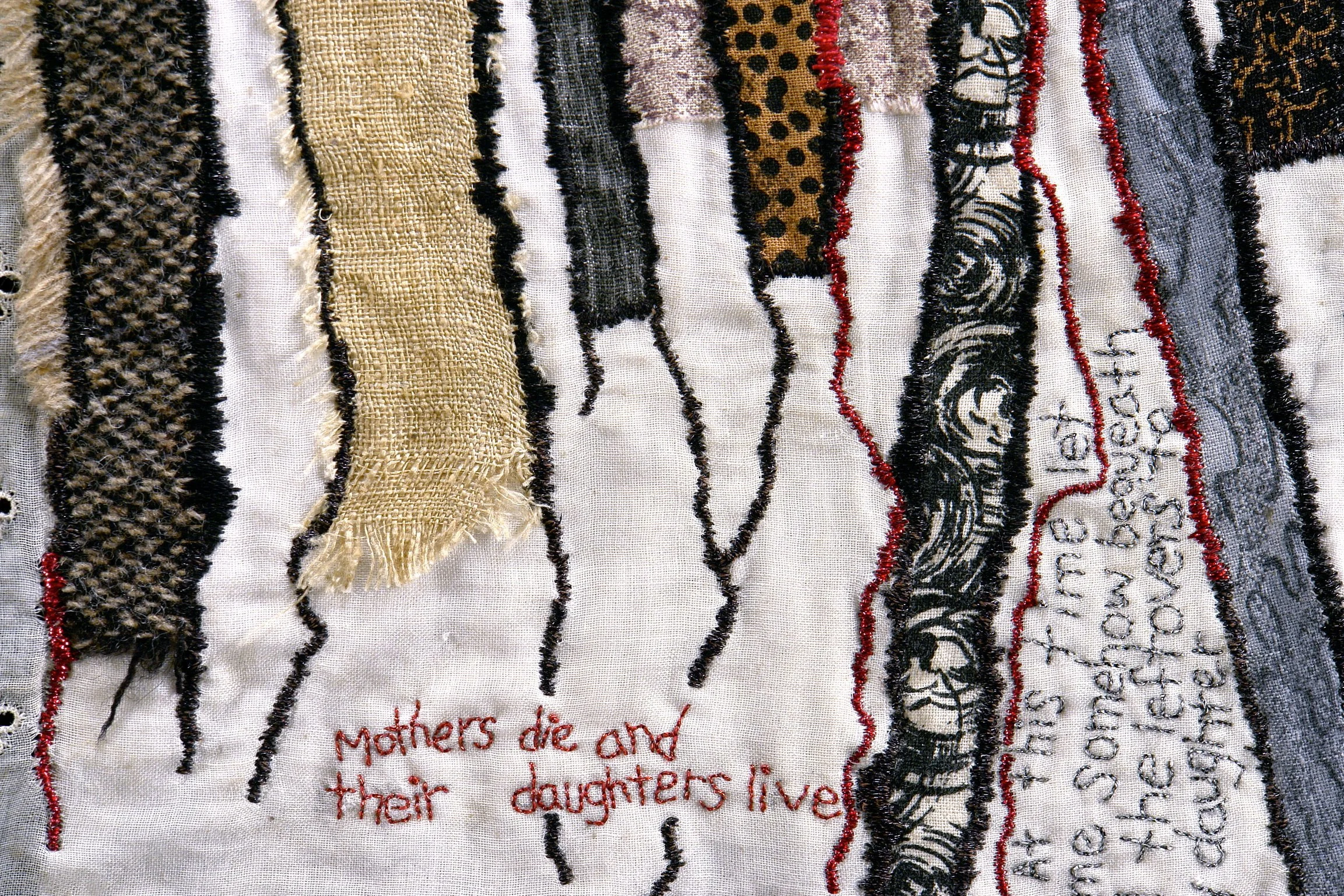 Schmata (Yiddish for “rag”): Hand-stitched on kitchen rag. 24 x 14 inches. Quotes: Anne Sexton, Deborah Keenan, Max Born, Martin Luther King Jr., Rabbi Perry Netter.